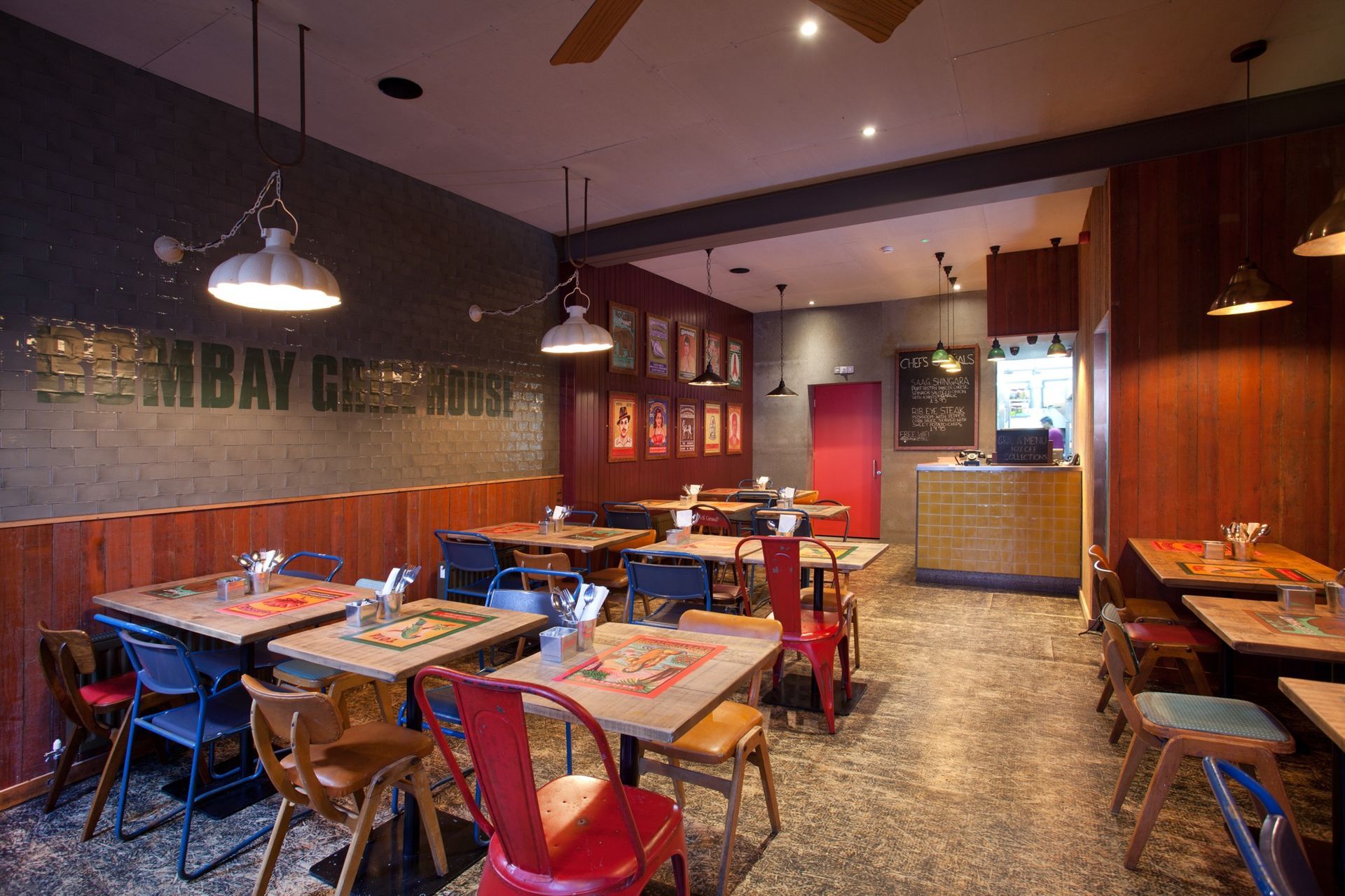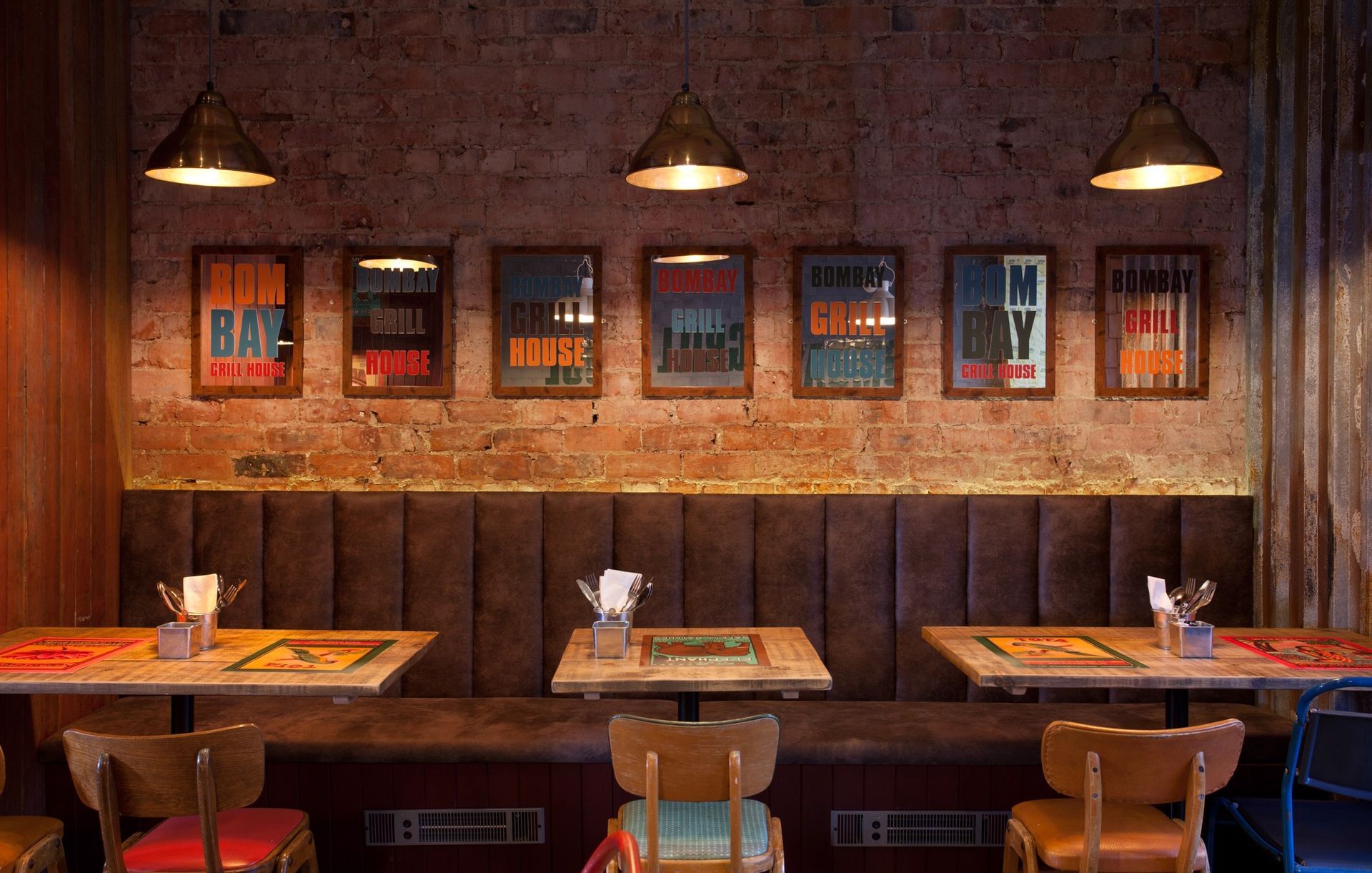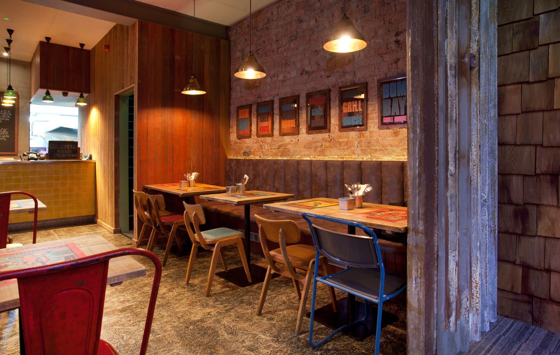 We created an interior with the vibrancy, atmosphere and feel found in the markets of Mumbai. Our choice materials allowed us to add a splash of modern British design, to create a space that is full of vitality, is welcoming and energetic. We took colour inspiration from 1950s Indian matchboxes whose imagery we have recreated in the interior, representing both the Indian Grill and the heat from the spicier dishes. The Bombay Grill House was an exciting project and working simultaneously on the both the interior and branding enabled NWD to create a strong visual identity and restaurant environment that echoes the ethos of the owners, the restaurant and the menu.