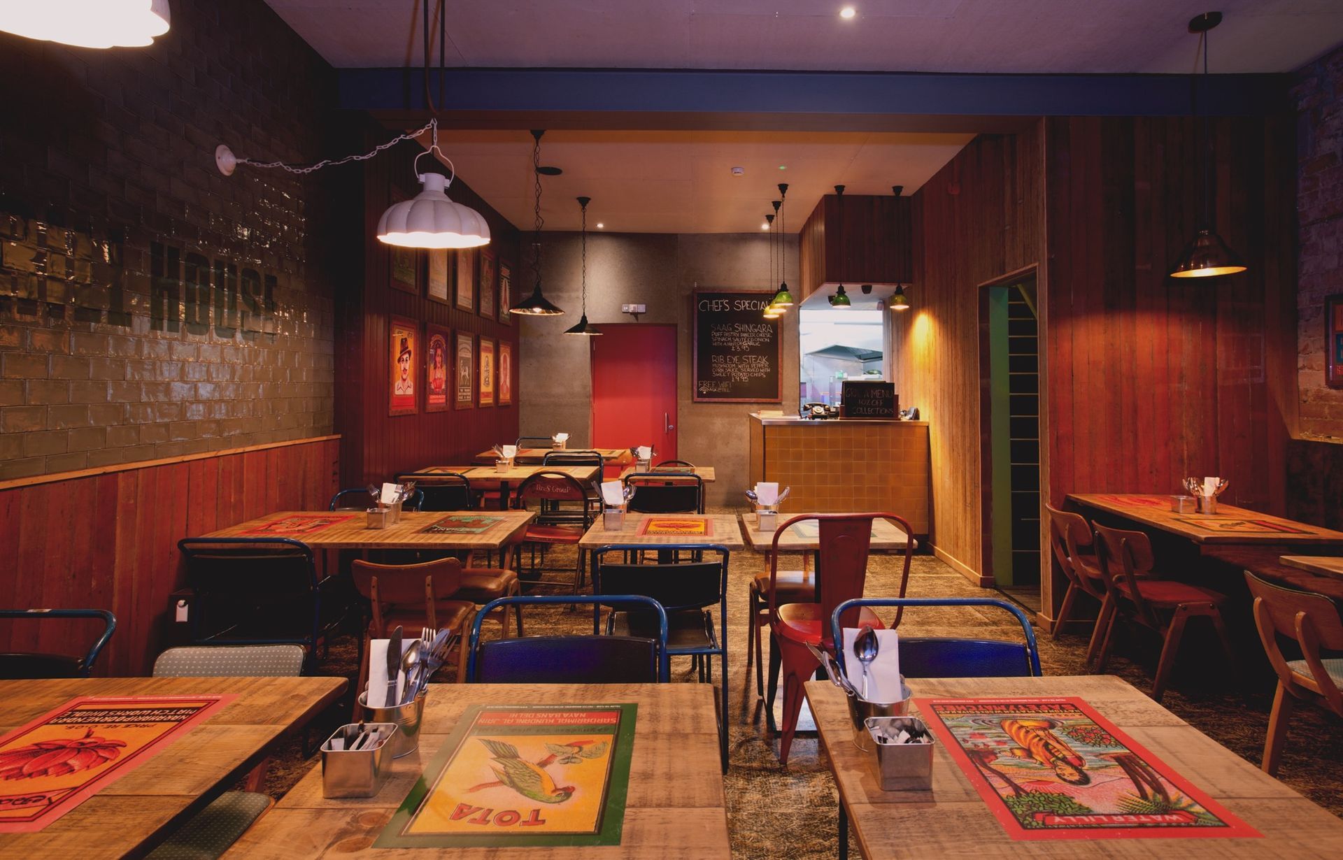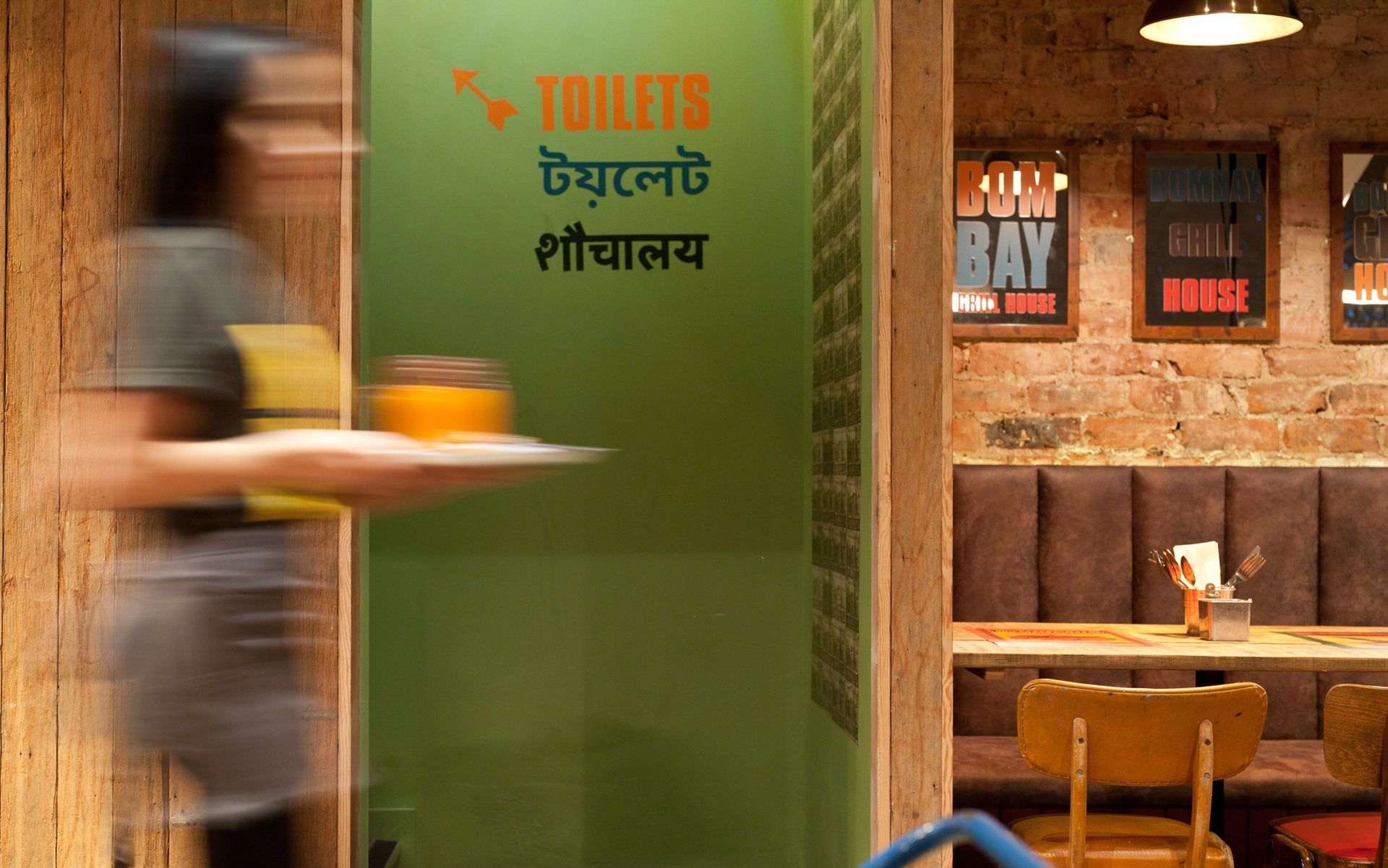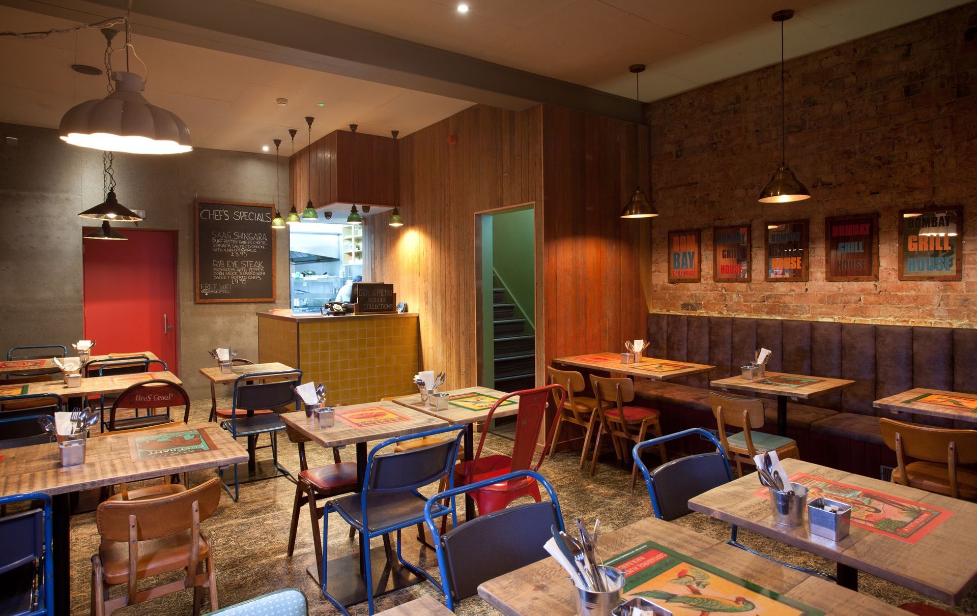 We created an interior with the vibrancy, atmosphere and feel found in the markets of Mumbai. Our choice materials allowed us to add a splash of modern British design, to create a space that is full of vitality, is welcoming and energetic. We took colour inspiration from 1950s Indian matchboxes whose imagery we have recreated in the interior, representing both the Indian Grill and the heat from the spicier dishes. The Bombay Grill House was an exciting project and working simultaneously on the both the interior and branding enabled NWD to create a strong visual identity and restaurant environment that echoes the ethos of the owners, the restaurant and the menu.